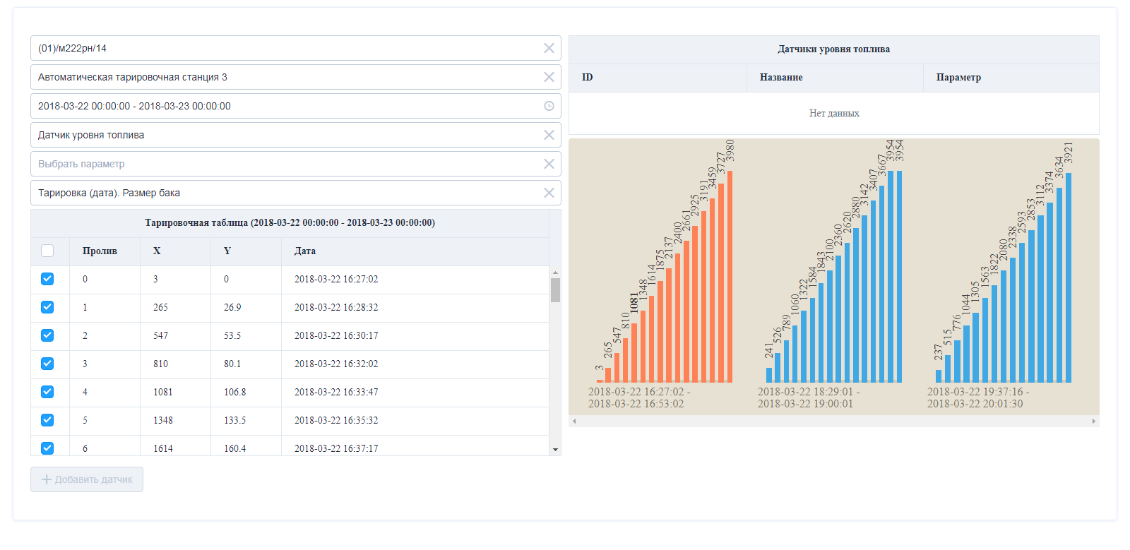 Данные о количестве пролитого топлива, номерах проливоов, режимах работы передаются в трекер для передачи на сервер мониторинга. В результате на сервере имеем статистику работы станции, данные о проливах и т.п. Данные используем для построения тарировочных таблиц.