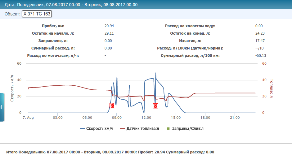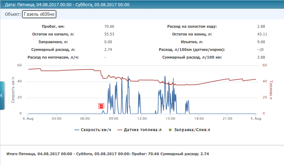 29.05 произошло вообще странное, машина утром выехала с базы, остановилась возле заправки, заправилась под горловину и поехала на "дальняк". На графике топлива машина проехала 480км (до предполагаемой очередной заправки) а на графике уровень топлива не менялся, колеблясь на уровне 62л (т.е. не КЗ со значением 4095 как было бы в случае воды на дне). После этой заправки (видать нормальное топливо было) пошел расход на графике. Далее машина приехала на точку, постояла час, затем после того как она проехала 30км показывая расход с уменьшением вдруг опять зафиксировался уровень на 42 литрах и она до конца дня и следующий день ехала на этих 42л. По возвращении из рейса она нормально заправилась, показав точную заправку в 30л, после чего уже таких зависаний уровней не было, но начались частые ночные скачки. Т.е. машина остановилась на базе, топливо пошло на 3л вверх, резкая коррекция до первоначального, затем опять вверх, опять резкая коррекция, и так до 3-х раз за ночь.