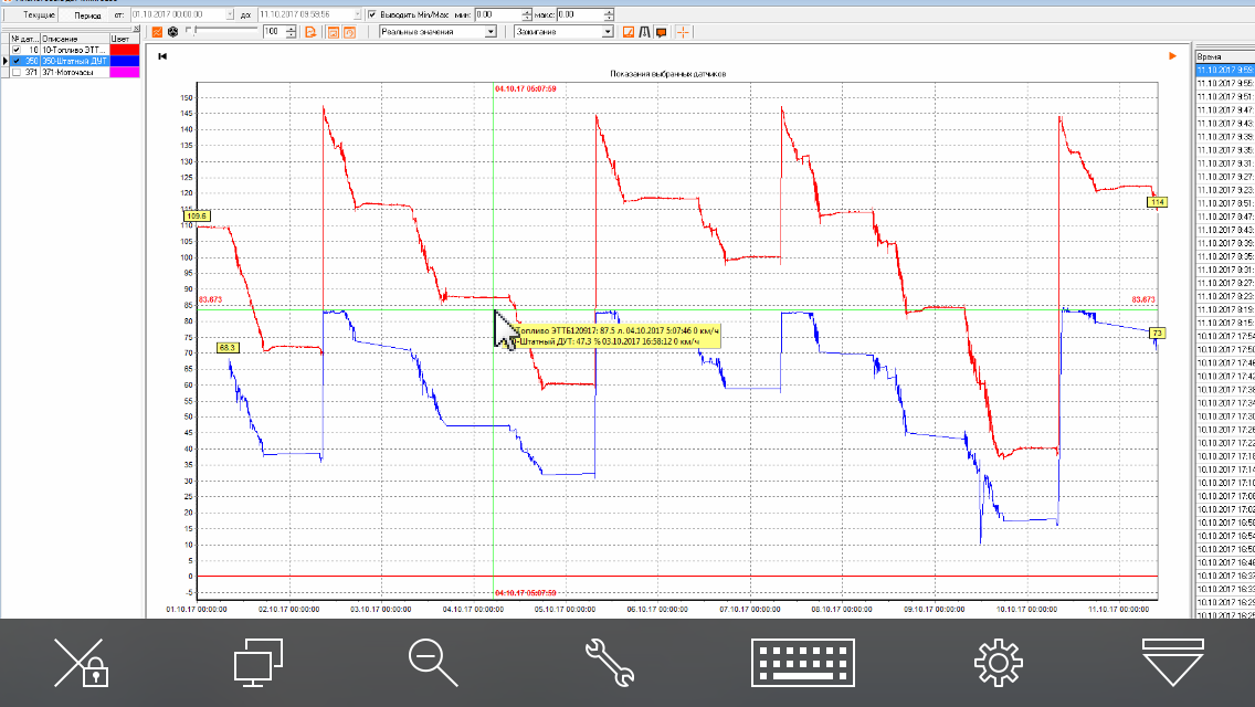 Volvo BL график красным цветом дут эскорт тд100(в литрах), а график синим цветом данные со штатного дута через can(в %)