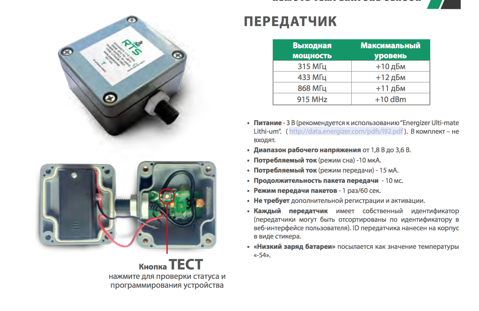 - Передача данных производится по радиоканалу (433 MHz), данные передаются 1 раз в минуту;