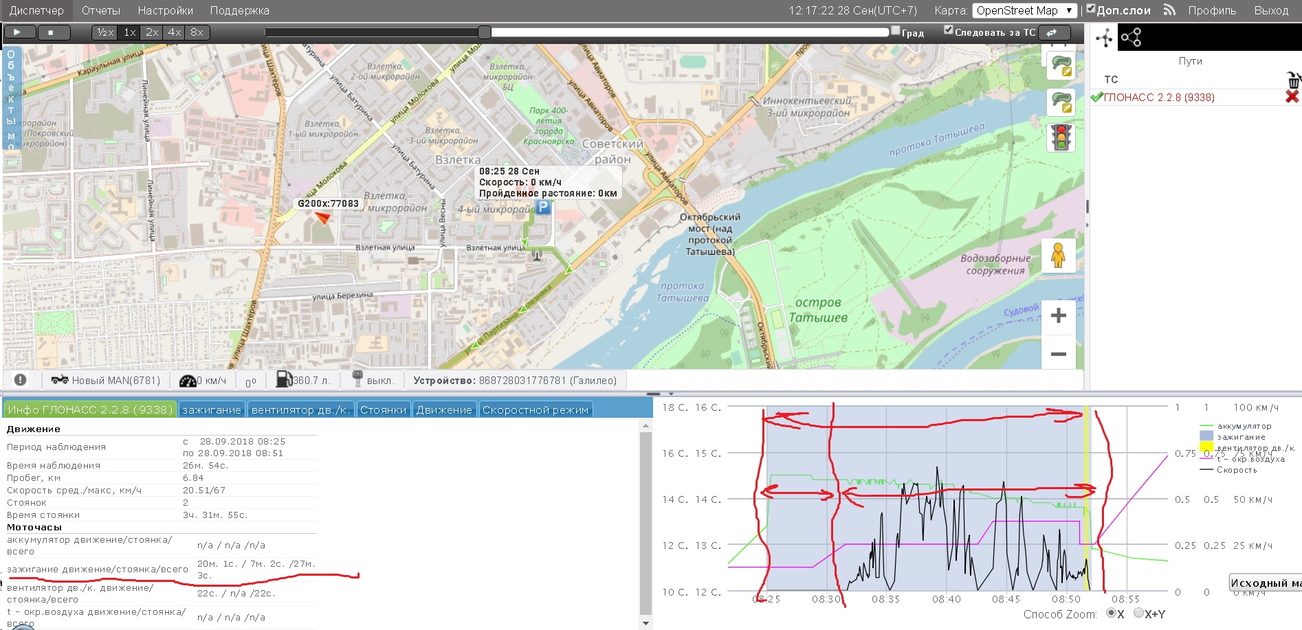 Однако. Если мы посмотрим на график, что увидим, что зажигание работало 28 минут, а именно поездка длилась 21-22 минуты. Т.е. приходим к выводу, что отчет неправильно считает именно моточасы, а не длину поездки. Жду ответа тех.поддержки виалон. Такая простая задача, посчитать время со статуса датчика, а вышла целая история...