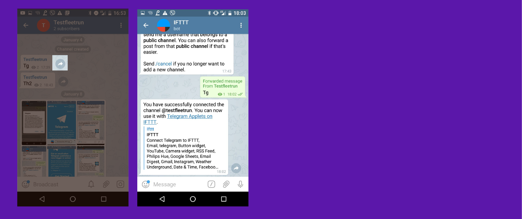 IFTTT при помощи функции forward message. Вы подключены! Бот вам это подтвердит.