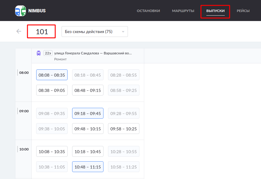 Затем на странице Рейсы нужно выбрать вариант отображения по выпускам и назначить объект на все объединенные расписания одним кликом.