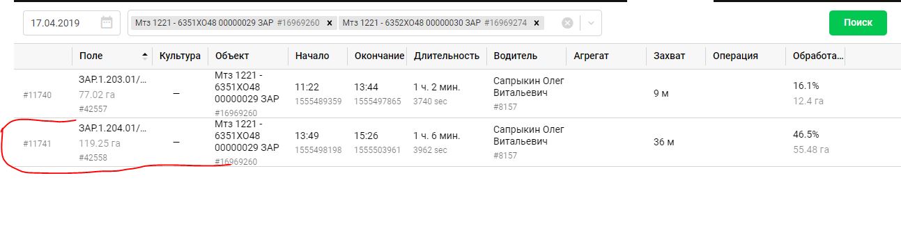делаем отчет с 01.06.2020 по 16.06.2020 обработанная площадь составляет 1252,89