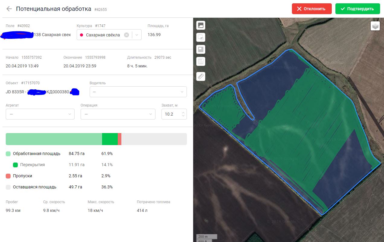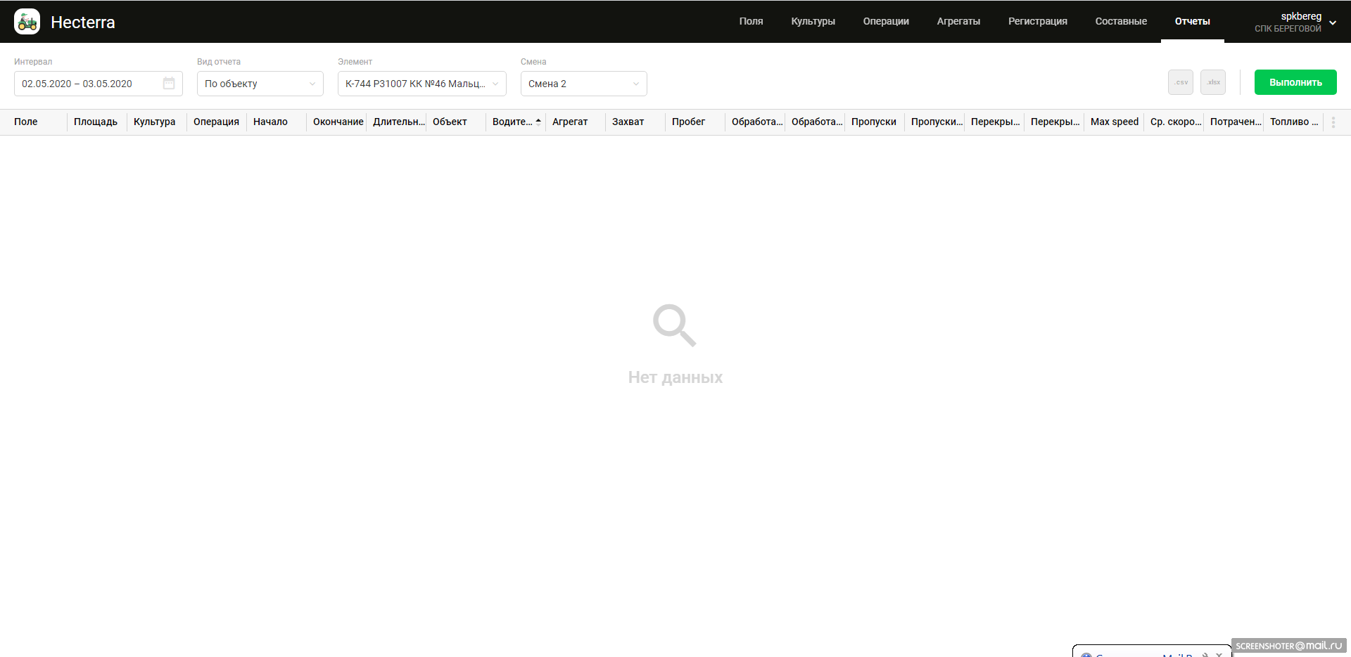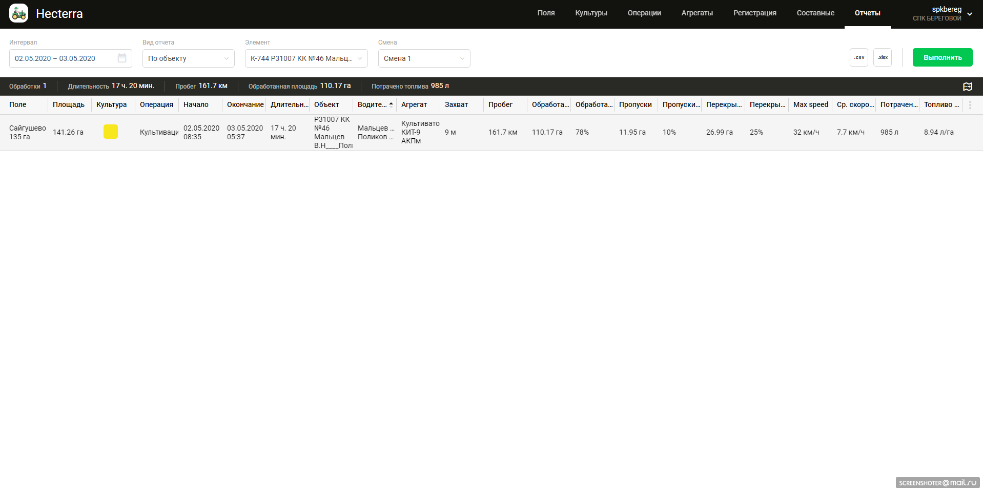o.rosenko wrote:Добрый день. На поле выполняются работы и меняются только водители физически , объект не выезжает с поля, привязки по карточкам нет, при регистрации обработки получается один интервал в сутки (https://prnt.sc/vkm1fm) и нужно разделять работу по сменам. Когда настраиваешь смены в настройках ресурса, то как пишет справка вся работа уходит в одну смену если большая часть обработки попадает в допустим первую смену, хотя по факту работа была выполнена в 2 смены , просто в одной больше гектар ,а в другой меньше . Было бы отлично что бы выводилось как в Wialon , обрезало интервал и выводило чётко по установленым сменам количество работ.