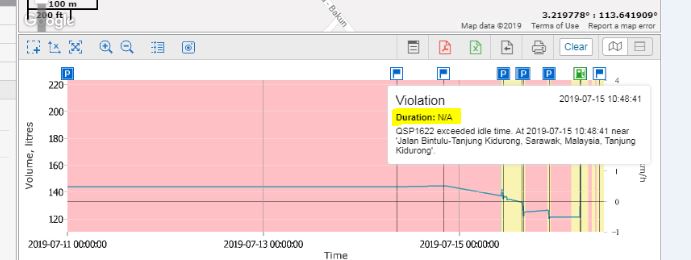 The second one is the 'N/A for Duration' found in chart. It happens for some violations/events such as Overspeed and Idling. Please refer to the attached file for screenshot. It shows a violation in term of 'Idling', but there is no value available for 'Duration'. We can get the duration of Idling from, say Engine Hour table, but why not in charts? It looks weird if the values can be found in one place but not another next to it. Please allow the charts to collect values of 'Duration' like tables do.