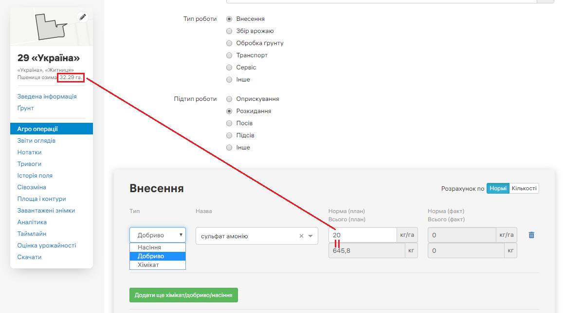 - внесение удобрений - норма внесения (л, кг, ц)/га(если нужно),
