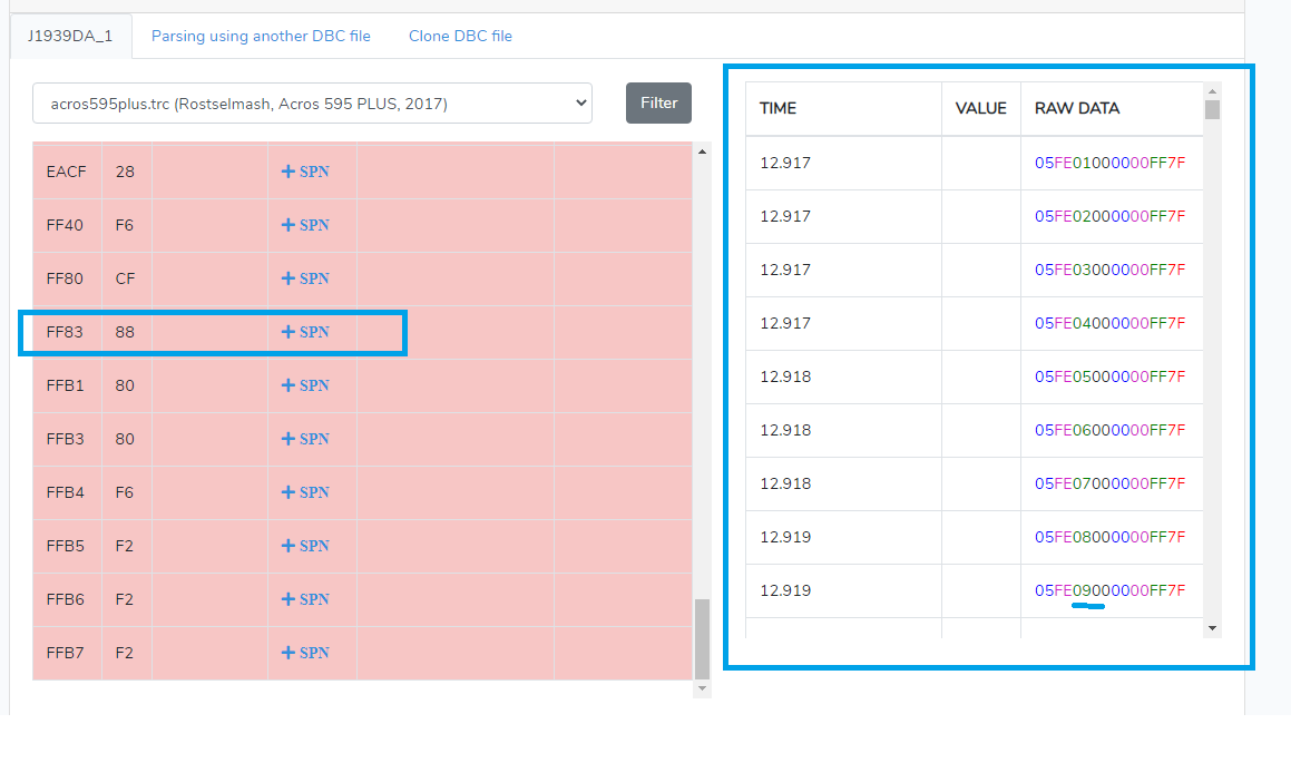 Текстовый лог расшифровывается сервером на основе дефолтных правил разбора CAN-шины. Например, типичным набором правил является CAN J1939 и такой модуль на сервере есть. Вы  сразу получаете информацию об имеющихся параметрах, можете строить графики. Что далее - каждый производитель кроме поддержки стандартных CAN-сообщений J1939, как правило, обязательно добавляет свои PGN, не описанные нигде. Путем построения графиков совместно с известными параметрами вы сможете установить, что они обозначают и создать собственный набор правил разбора (парсер), применимый для данной единицы техники. В сервис встроен редактор SPN, вы сможете редактировать чтение даже отдельных битов.