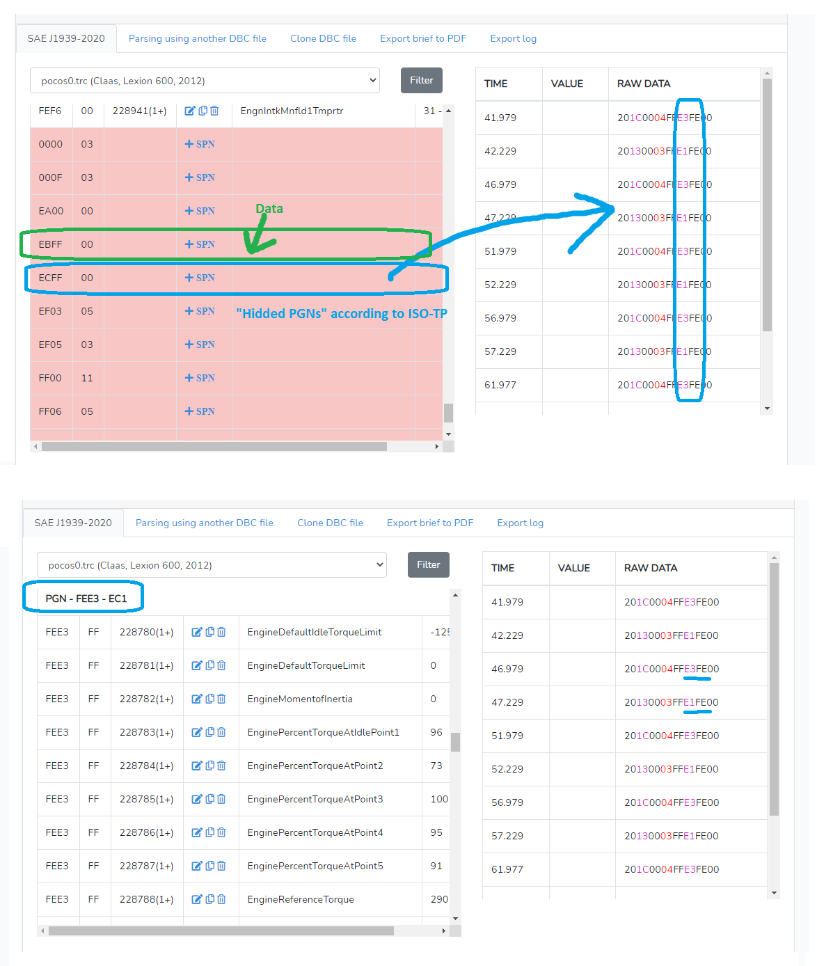 Теперь сервис can2sky.com умеет также анализировать пакеты данных ISO-TP протокола, который широко используется в J1939. Его особенность заключается в том, что передаваемый идентификатор (PGN) передается в поле данных PGN ECxx, а байты данных - в EBxx (см. рисунок). Сервис извлекает теперь эту информацию и добавляет "скрытые" транспортные PGN в общий список для анализа и построения графиков. Стоит отметить, что GPS-терминалы вряд ли смогут считать ISO-TP пакеты, но для полного анализа содержимого CAN-шины эта функция необходима.