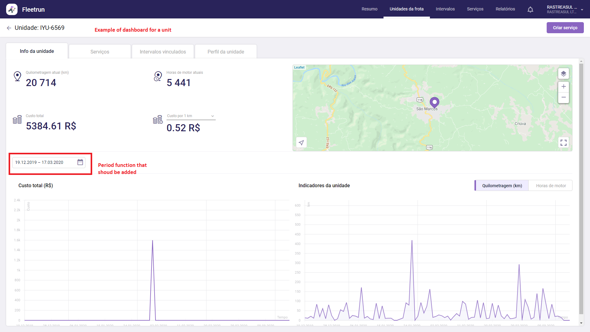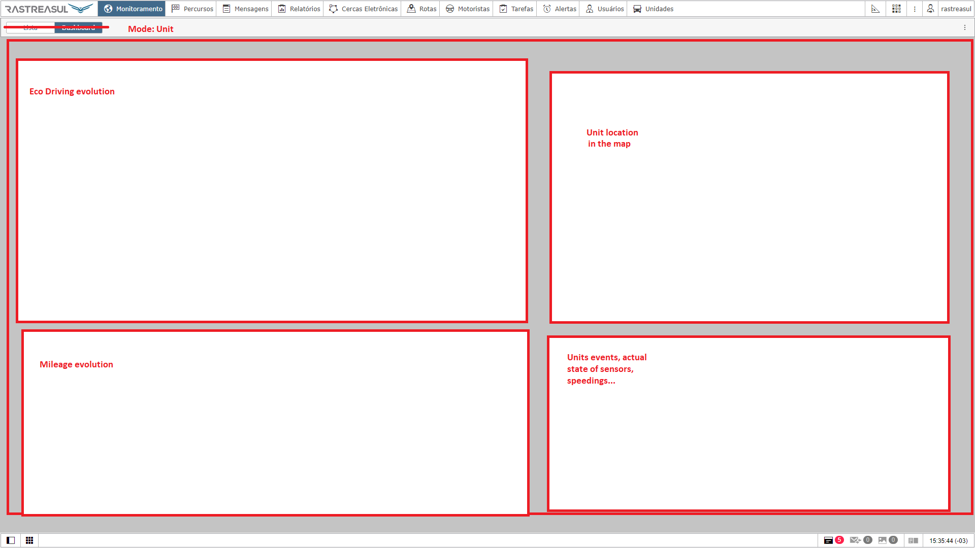 Unit would show just informations about the unit: its evolution of mileage, engine hours, sensors state, events, notifications, eco driving score, besides showing it's location in a map (like the panels inside Fleetrun).