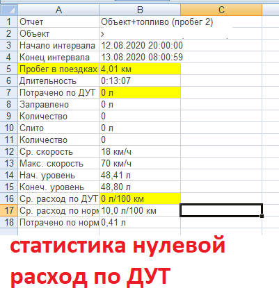 Проблема №1: расход по ДУТ равен нулю(в основном при сменах с небольшим пробегом). Такое наблюдается, если начальный уровень топлива меньше конечного в периоде отчета(такое достигается из-за скачков уровня топлива в баке). Как я думаю: начальный уровень 48.41 л, конечный уровень - 48.80 л. Получается по датчику получился отрицательный расход.