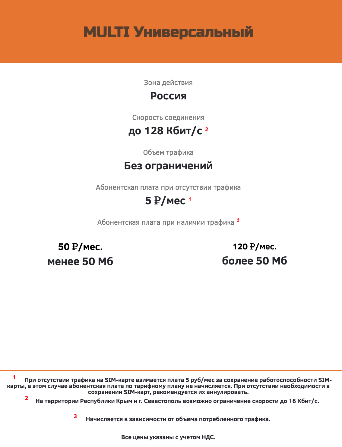 до 50 МБ -50 руб/мес, свыше 50 МБ потребления трафика по 120 рублей за SIM-карту.
