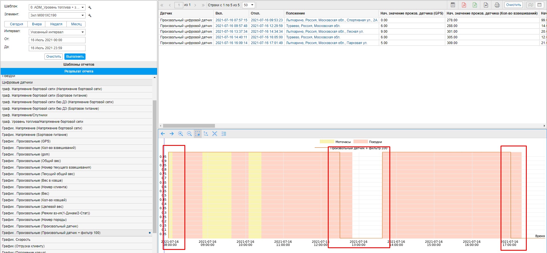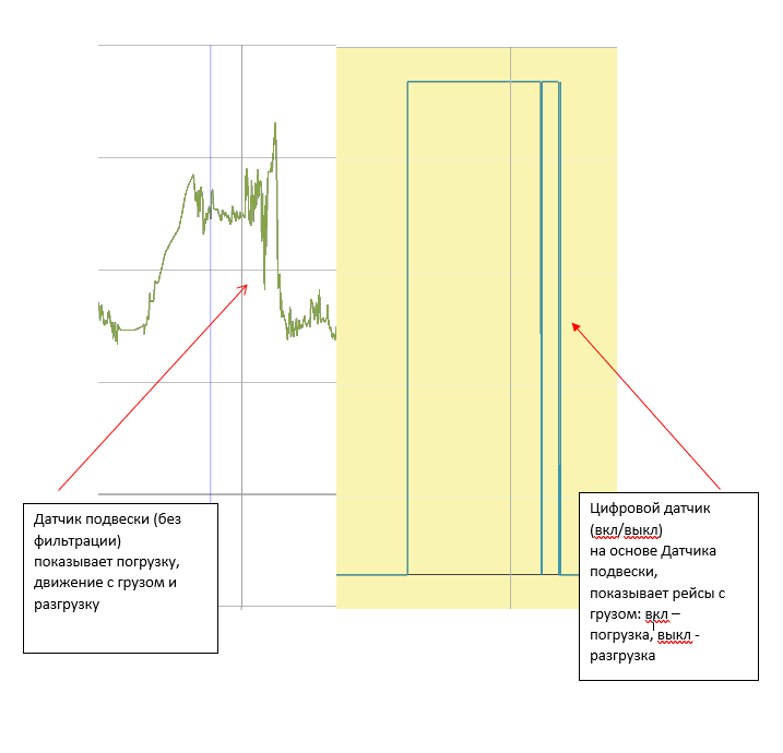 Проблема заключается в том, что исходные данные по произвольному датчику подвески периодически падают сверху до порогового значения в цифровом датчике и в итоге в таблице мы получаем либо один рейс разделенный на 2, либо, если отсечь настройками отчета мелкие рейсы, получаем некорректный по времени и плечу рейс в отчете. И то и то не хорошо.