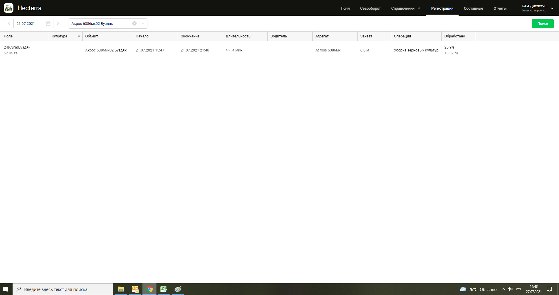 Не знаю как происходит работа в других компаниях, но у нас одно поле может убираться 2, 3 а может и больше дней.