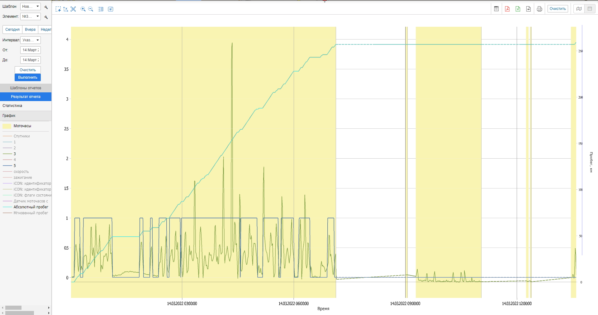Глядя на график можно увидеть, что цепочка датчиков, призванных для решения данных проблем работает. Пробег растёт только в рамках активного изменения ускорений ТС связанных с его движением.