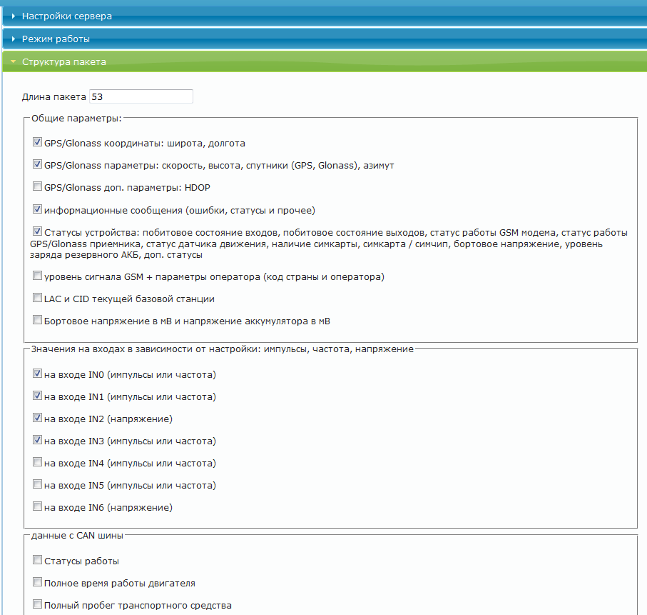 glonass-ekb Используйте WEB-конфигуратор. Раздел "Структура пакета". Можно еще покрутить "Передача точек маршрута и значений датчиков" в части обработки траектории. Если там поставить слишком маленький угол - точки могу сыпаться на сервер раз в секунду.
