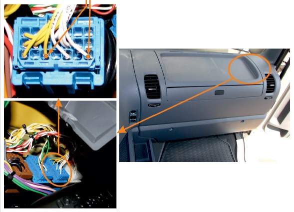 Справа у пассажира, над правым дефлектором, голубой разъем 21PIN (3x7), желтый 9 - H, белый 21 - L