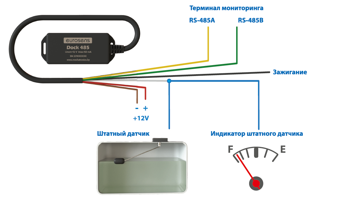 4. Контроллер Eurosens Dock является "улучшателем" сигнала штатного датчика. Он считывает сигнал напряжения со штатного датчика, корректирует его по напряжению бортсети, немного сглаживает сигнал, а также генерирует последнее верное значение с датчика после его выключения.  Выпускаем только версию на бортовое напряжение 12 В, так как на  грузовые и спецтехнику все же лучше устанавливать высокоточный ДУТ. (если сверление невозможно - см. выше вариант с Eurosens Dash).