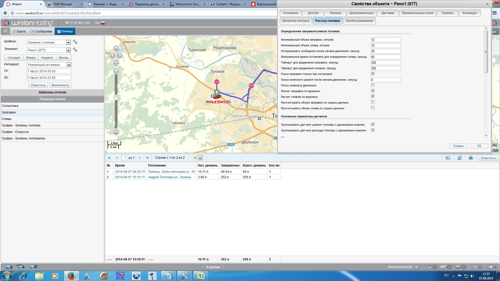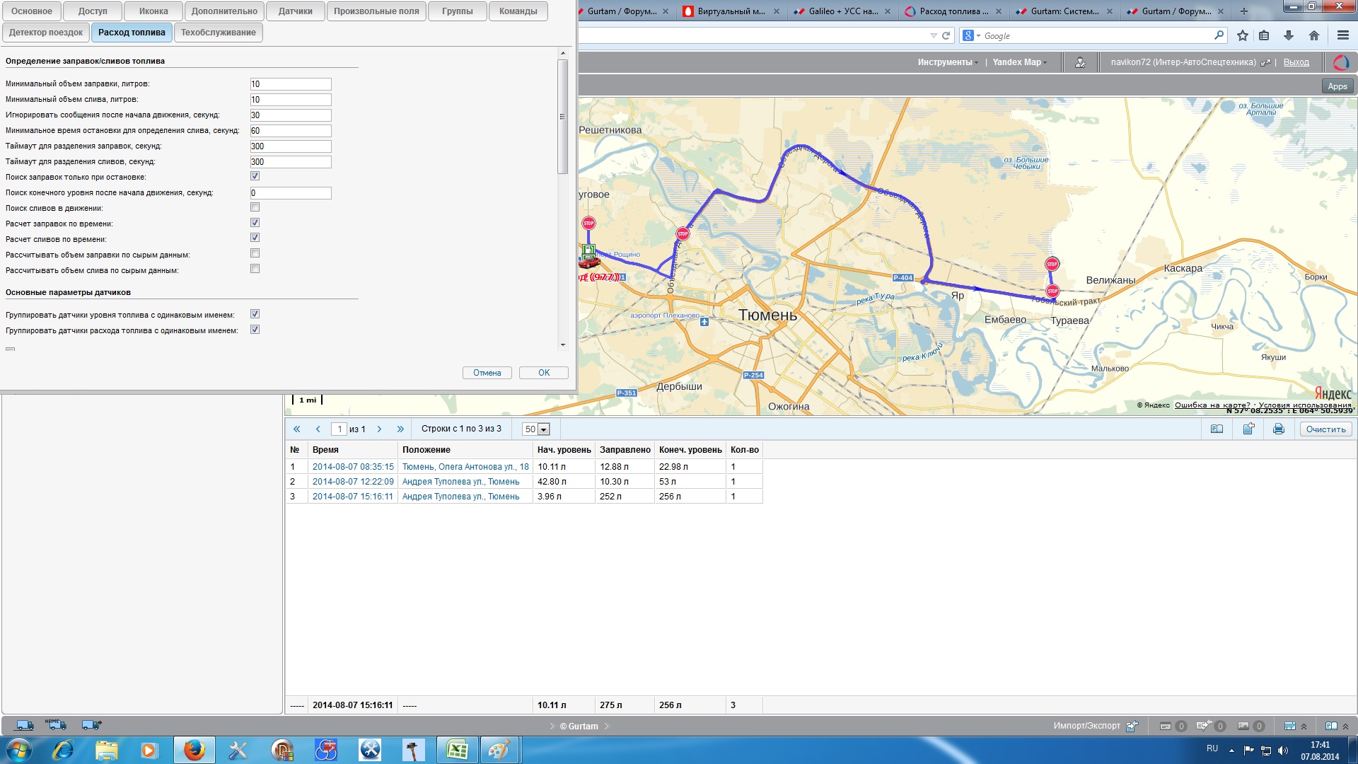 А вот так с настройками: поиск только при остановке нет, мин. объем заправки 10  интервал разд. заправок 300. Всего было за 07.08.2014 2 заправки и 2 слива на графике он видит их при любых настройках но считает непонятно как и откуда он берет эти цифры воопще не понятно.