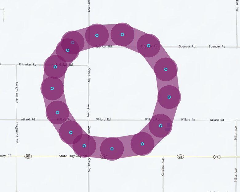 Проще всего создавать такую геозону по типу Линия, указав необходимую Толщину / Радиус "окружности". На представленном изображении толщина установлена 500 м.