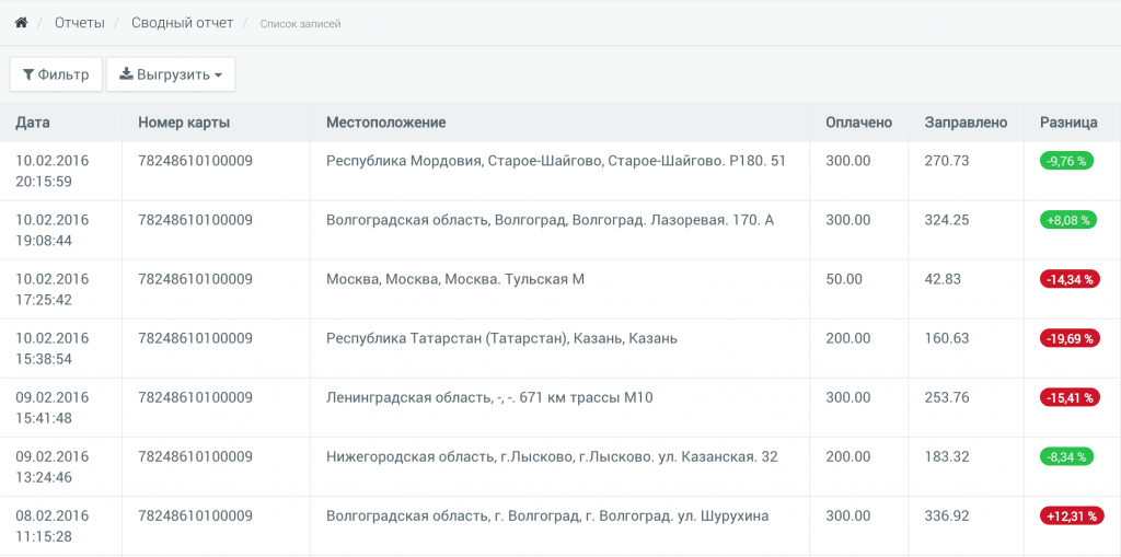 Далее система в автоматическом режиме сопоставит каждую транзакцию с мониторинговыми данными и предоставит сводный отчет. Вы можете сразу увидеть, сколько топлива было оплачено и сколько заправлено в автомобильный бак.