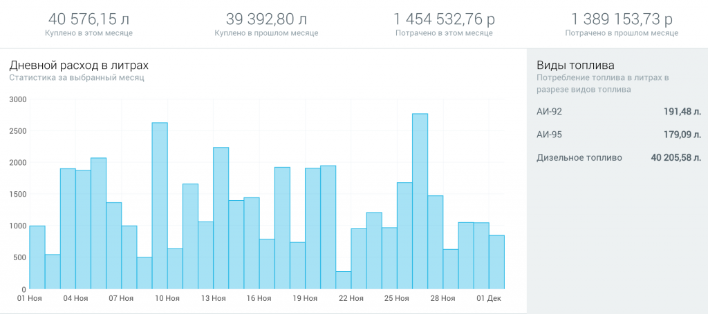 Сервис представляет собой облачное решение, которое доступно с любого устройства при наличии интернета. Первое, что видит клиент после входа в систему, – это рабочий стол. Здесь размещены основные данные по расходам на топливо за периоды, отраженные в графиках и тексте.