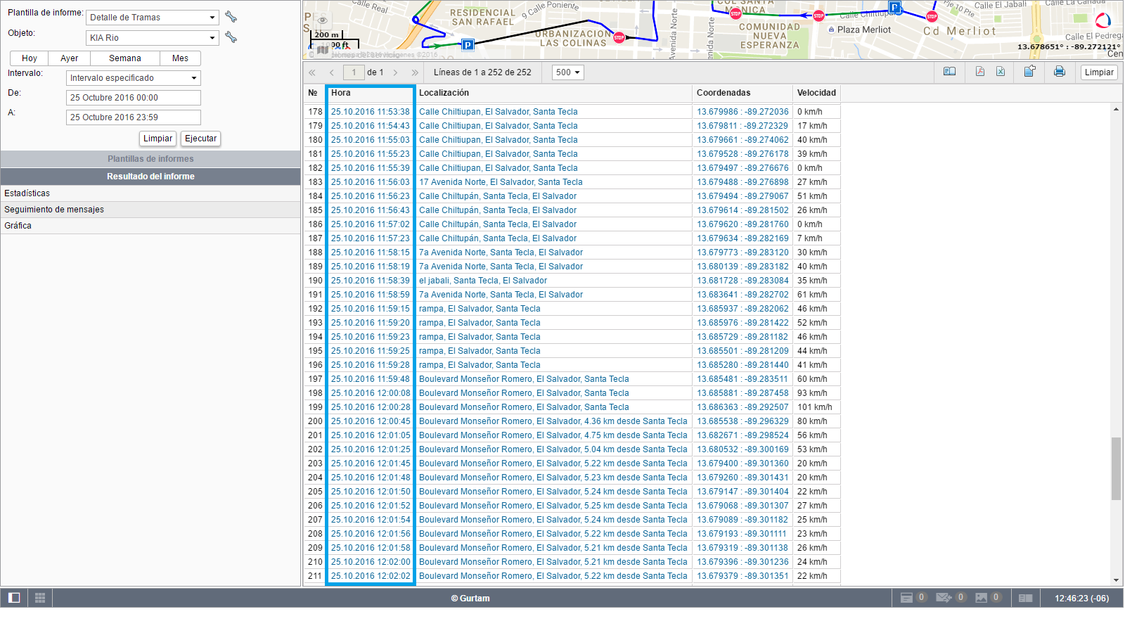 3. al colocar la SIM, el envío de tramas fue correcto y casi de inmediato, no así el calculo de viajes y kilometrajes, ya que si ejecuto un informe, el sistema me presenta la distancia y la velocidad máxima solo del tramo con SIM instalada, ignorando las demás distancias y velocidades que se enviaron retrasadas o que estaban en buffer, a pesar de graficar todos los datos en el mapa y mostrarlos en las tablas. Ver adjuntos.