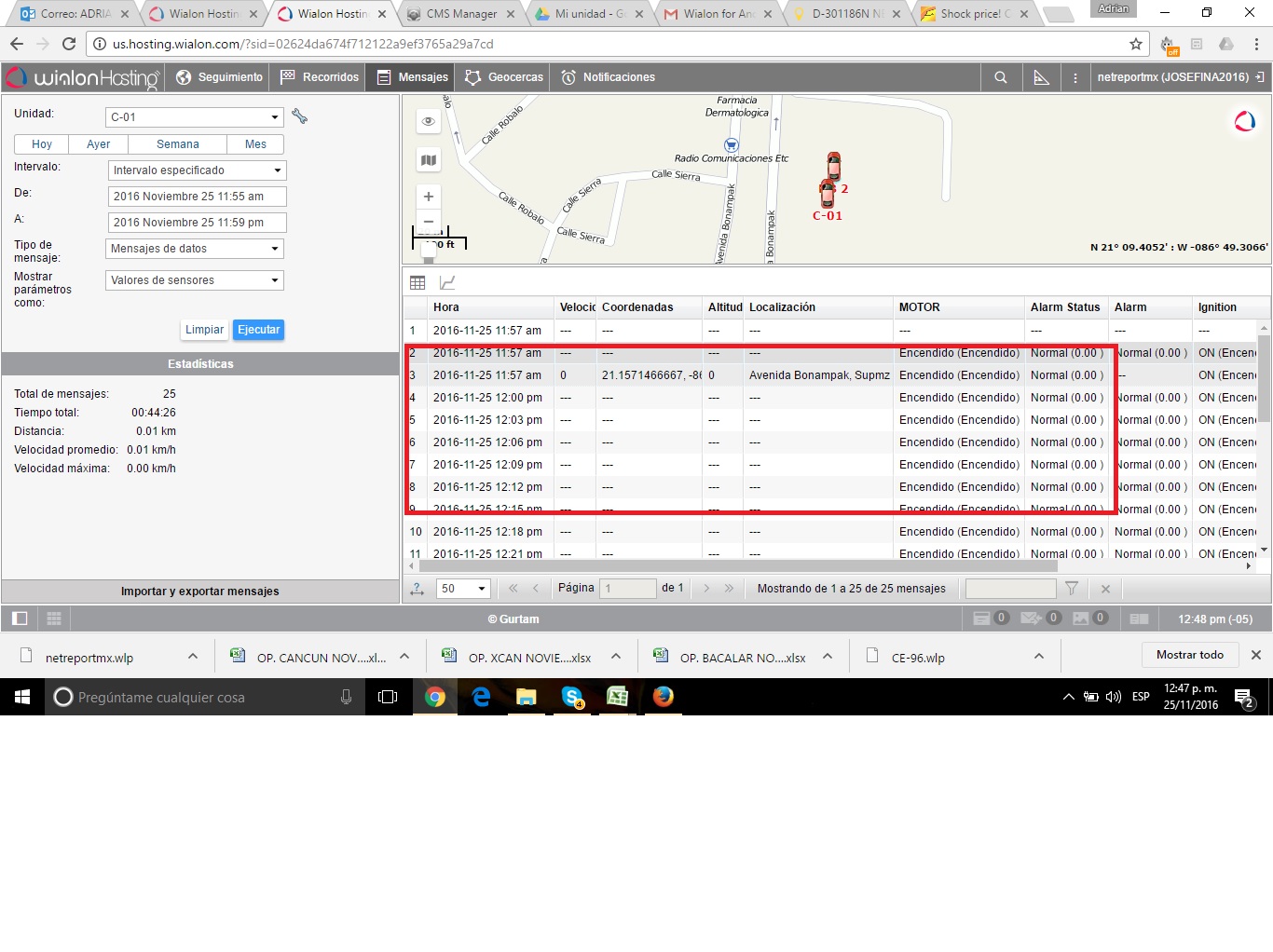 Cuando el dispositivo se encuentra detenido, deja de enviar información completa pero eso no es el problema, el problema es cuando entra a alguna zona ciega, cuando regresa a zona con señal, se emiten mensajes erróneos. El ejemplo claro lo podrías ver en los mensajes del día 16 de octubre aproximadamente a las 11:07 am a 11:34 am, como he comentado anteriormente.