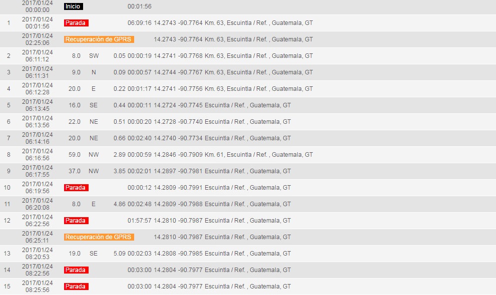 Mostrando en un reporte o historia de 24hrs (por ejemplo) todas las ubicaciones donde estuvo el vehículo y mostrando a la par, cuando se detuvo y el tiempo, si el equipo dejo de transmitir por algún tiempo, se activó alguna alarma por ejemplo detector de puertas o botón de pánico.