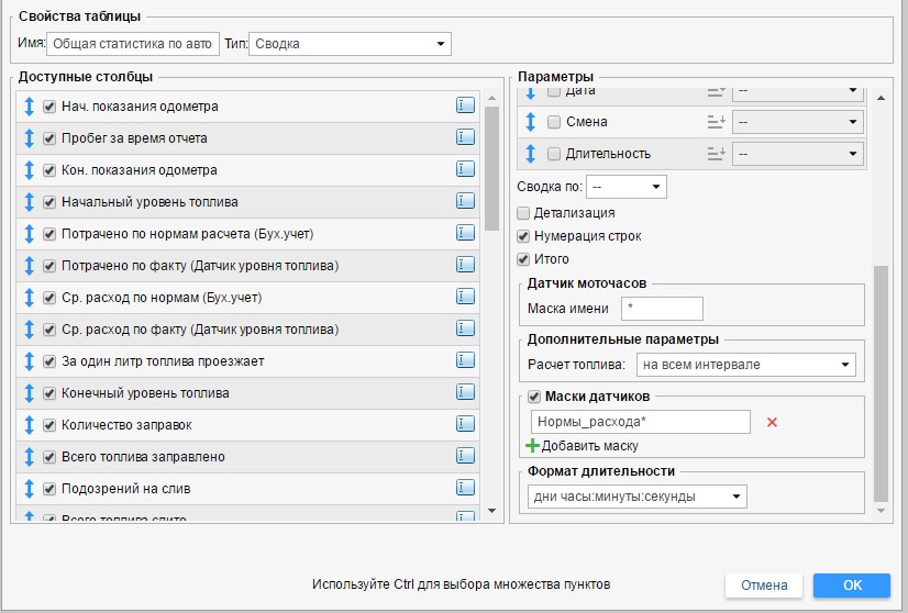 При наличии у объекта нескольких датчиков типа "ДПРД", повышающий коэффициент рассчитывается как сумма коэффициентов всех датчиков этого типа по формуле: k1 + (k2 - 1) + (k3 - 1) + ... Поэтому датчик типа "ДПРД", созданный для учета утилизации, полезной работы и др., будет влиять на расход топлива по расчету.