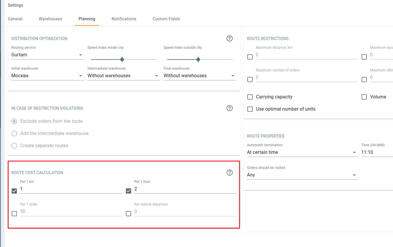 Besides, we have made improvements to the routes created from templates: now their cost is also calculated if its calculation parameters are specified on the Planning tab of the settings.