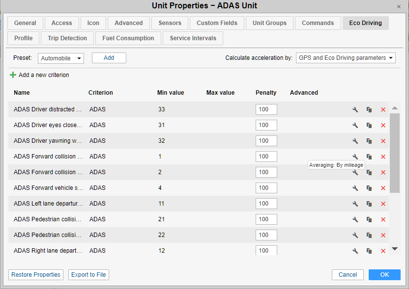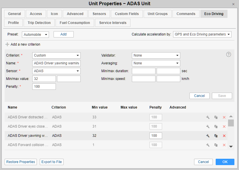 Los 14 eventos ADAS se pueden agregar como eventos de violación en las propiedades de unidades en Conducción Eficiente. Estos se usarán para generar el Informe de conducción eficiente junto con las imágenes de eventos de ADAS.