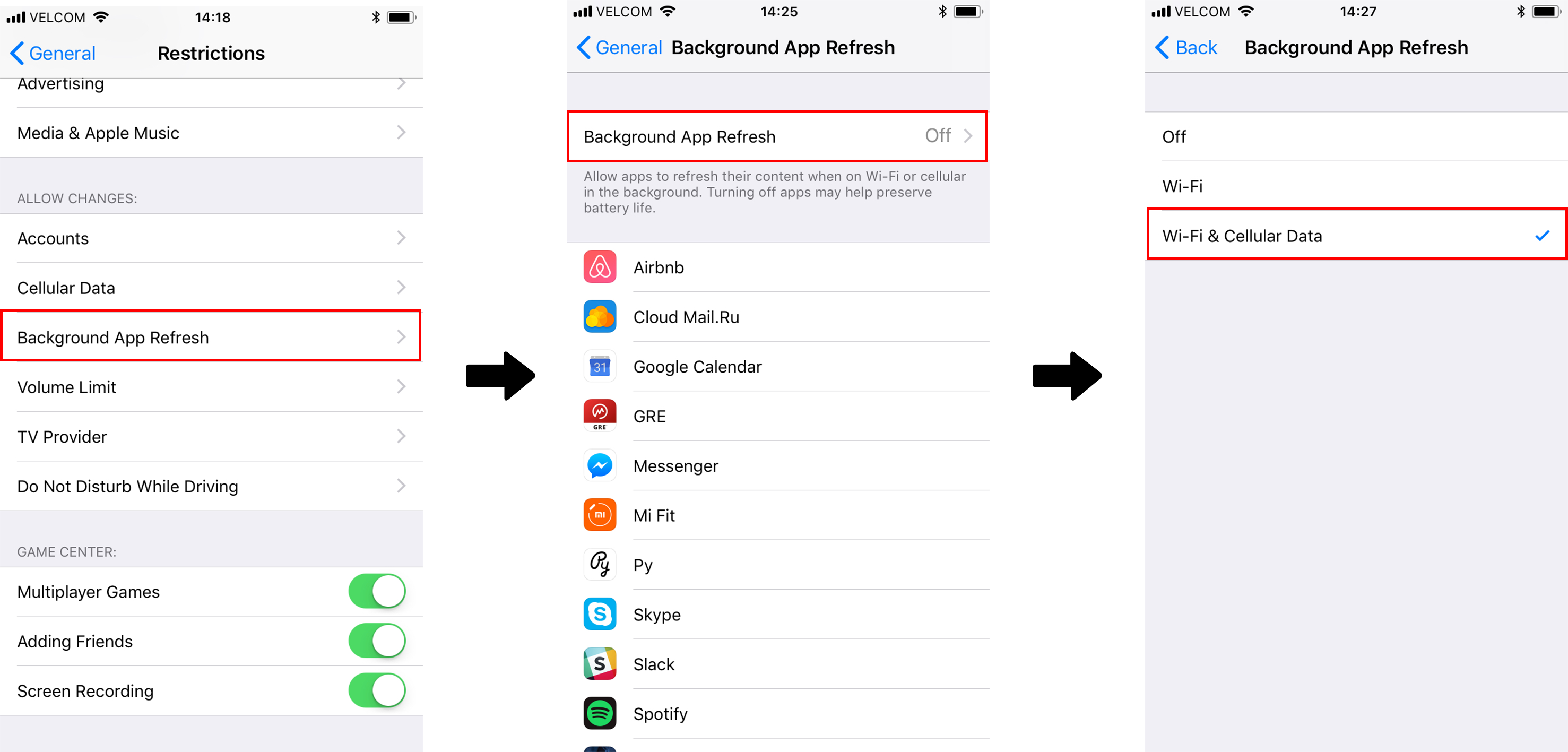 A continuación, asegúrese de que el usuario no tiene permiso para cambiar la configuración de Actualización de la aplicación en segundo plano en Restricciones: