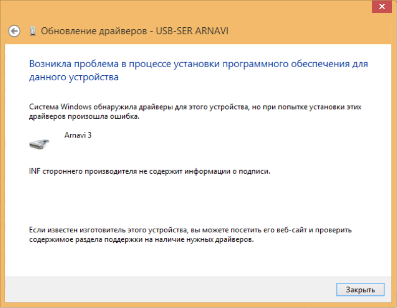 скачал диагностическую программу для Арнави 3, но не могу установить USB драйвер. у аруснави драйвер только для винды 7 вроде. по крайней мере на 8.1 не ставится. пишет что то про подпись (скрин приложил).