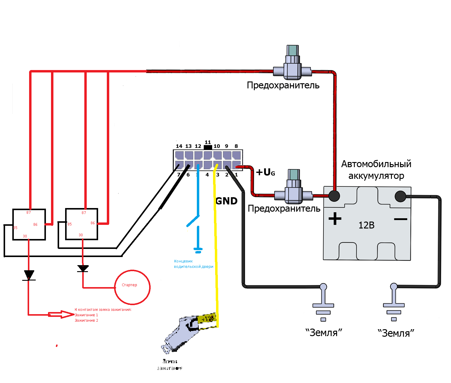 Так же установим реле защиты стартера, которое сработает и отключит подачу питания на стартер при запуске машины.
