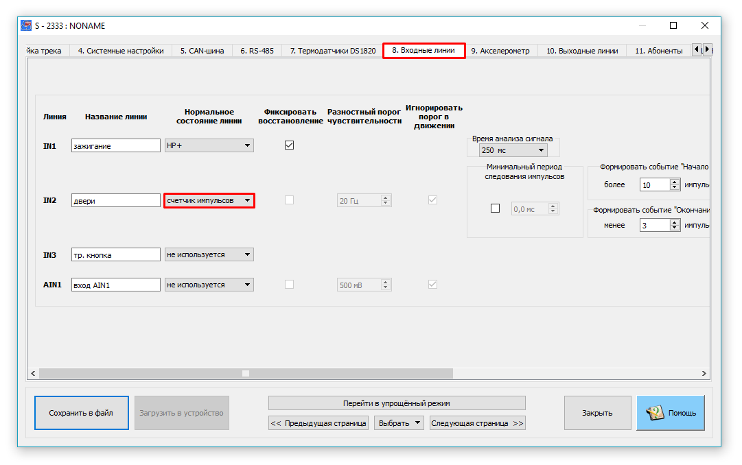 2.3. (Дополнительно) Если необходимо использовать фильтрацию дребезга на линии подсчета, ввести дополнительные события или определить логику обнуления счетчиков, то можно воспользоваться дополнительными настройками. Их подробное описание приведено в разделе "Помощь".