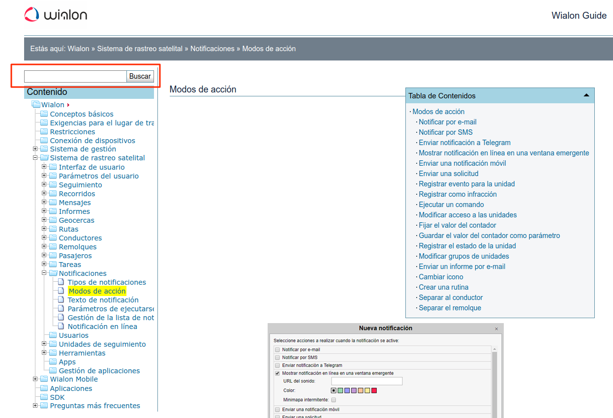 En la documentación de Wialon hay una barra de búsqueda que puede ser usada bara buscar el material.