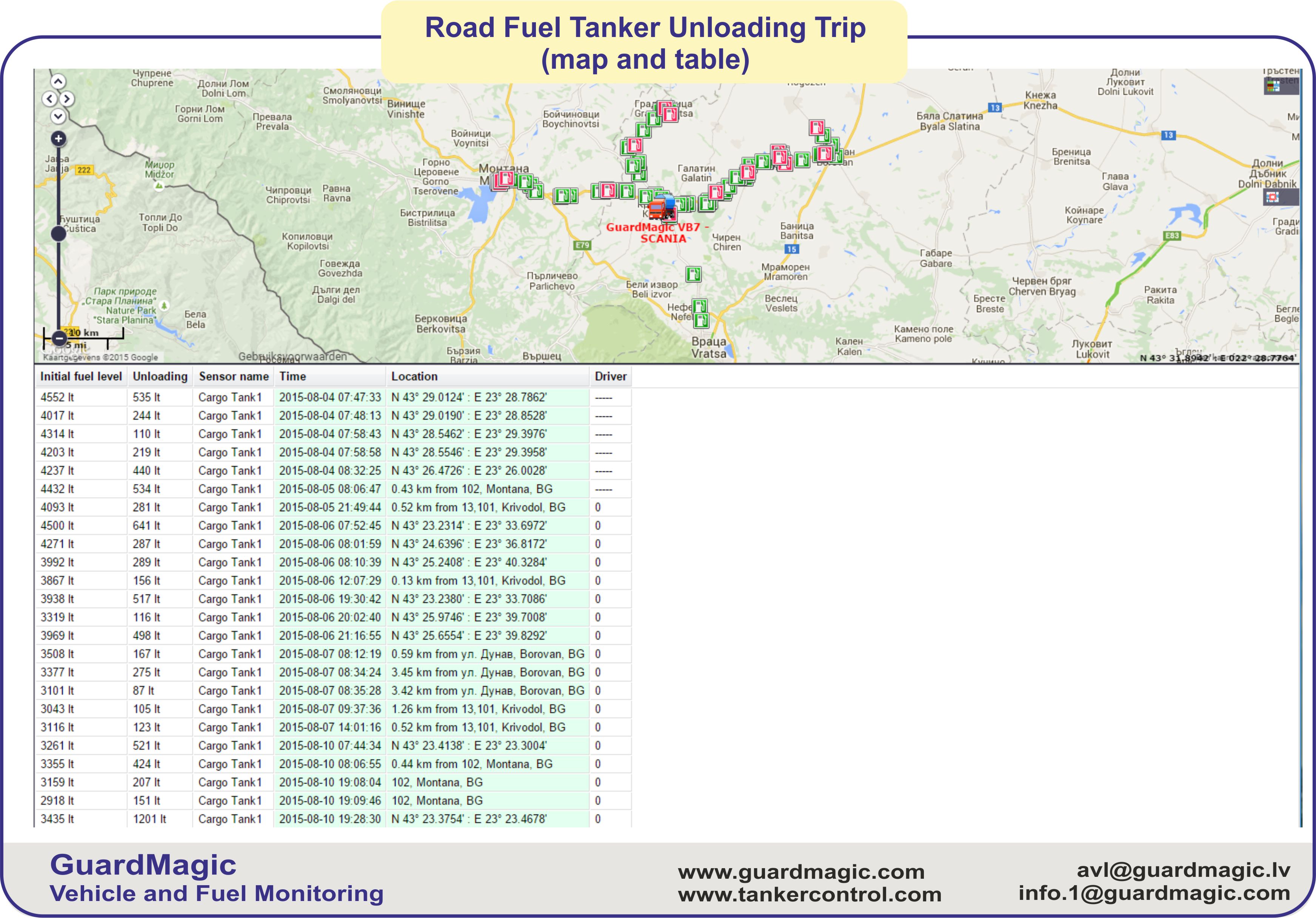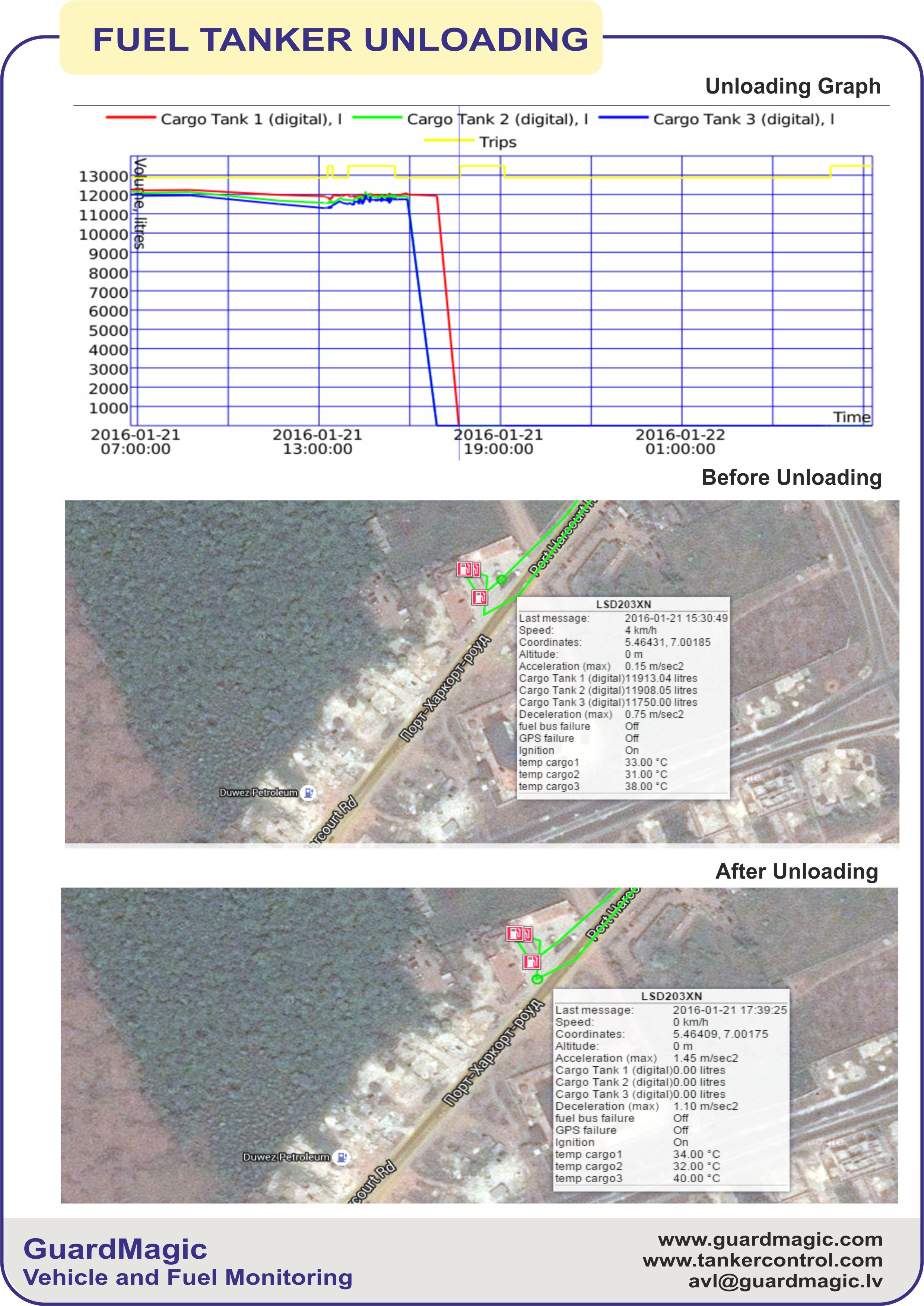 GuardMagic Road Fuel Tanker Monitoring System in a full automatically mode, "day & night" collects and stores detailed information about fuel cargo tank contents and tanker activity.