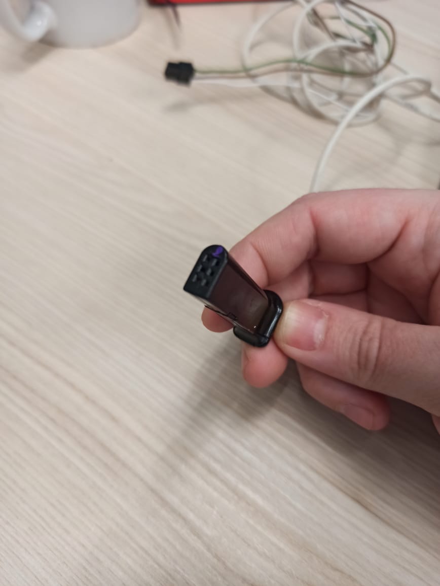 Мы использовали 6-пиновый разъем от терминала Сигнал 2551. Срезаем язычок, вставляем 3 провода (земля, Rx, Tx), провода в оплетку, сверху термоусадка