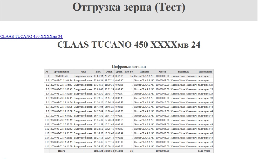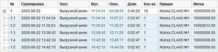 Вот пример отчёта цифровых датчиков (т.к. нас интересует когда включился\выключился шнек и какое ТС было в зоне выгрузки)