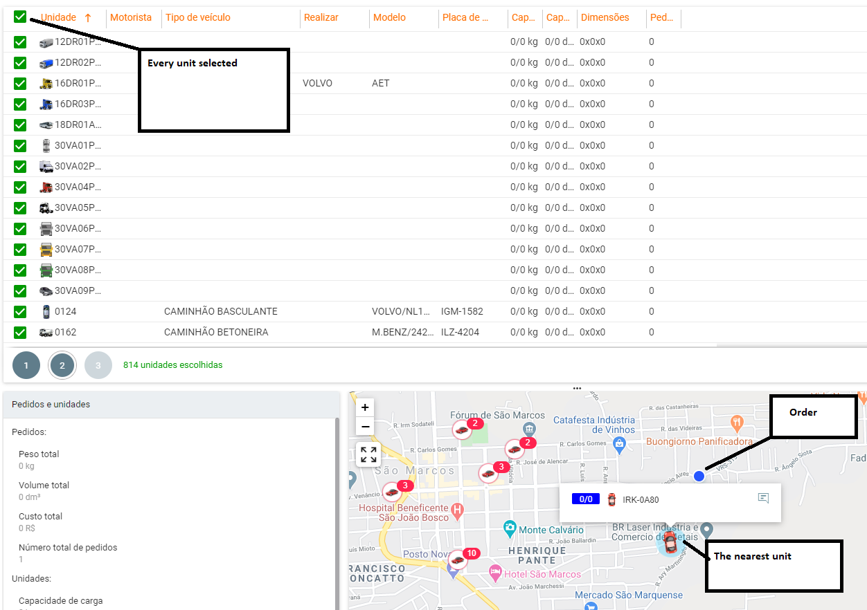 The orders comes randomly, the vehicles are always riding around the city randomly too. When a new order is generated, the client must select the nearest unit of the order location (by eye) because the app doesn't select automatically.