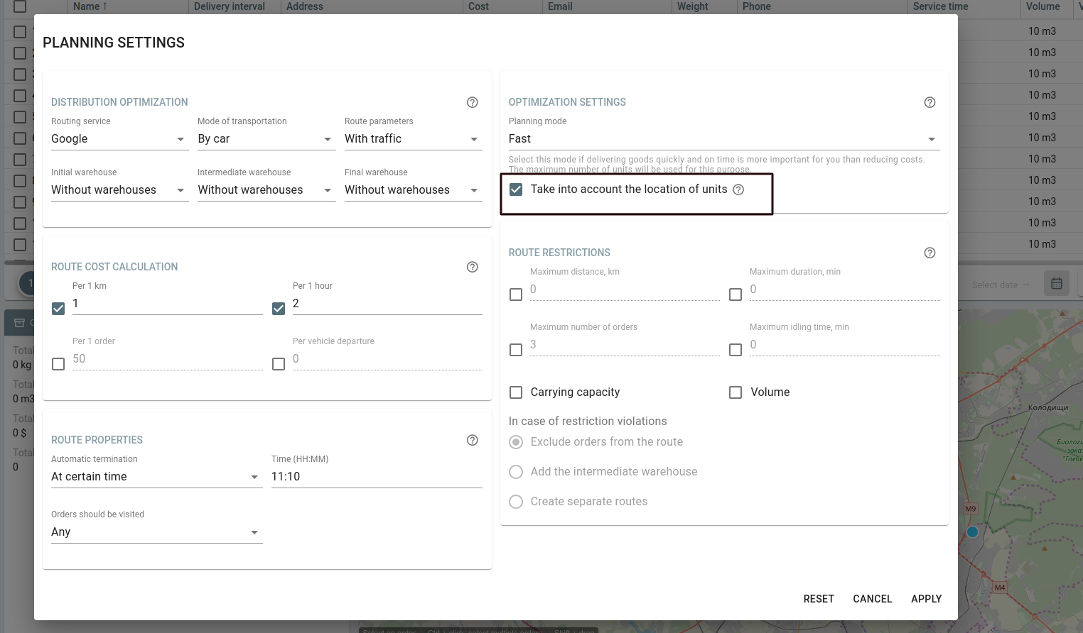 For example clients that work with gas delivery sometimes have the unit finishing a delivery and the vehicle is with engine off, in this cases the right thing to do was to exclude only vehicles parked inside their base, in this case could be selected a geofence for vehicles to be excluded, not to being taken into account when distributing the orders.