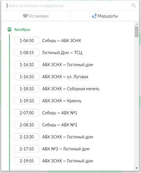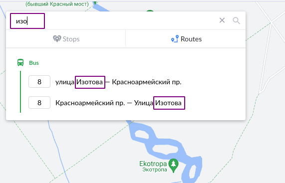 В результирующем списке выводить только те маршруты, которые попадают под данный запрос с учетом последовательности остановок – сначала начальная, потом конечная (см. фото ниже). При выборе маршрута, как и сейчас, раскрывается список всех остановок.