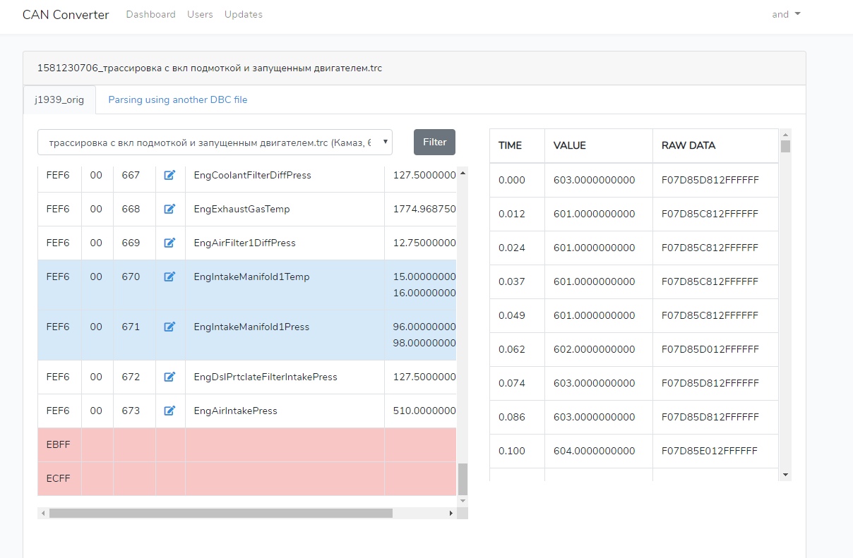 Here is a free web-service for can-log parsing and visualisation in form of readable parameters and plots. Parser is based on DBC-files, there are some default DBC-parsers including J1939 protocol. You can create your own parsers based on it with built-in editor (see pics) and upload your DBCs too. Further development includes collaboration of users and DBC-sharing between users for p2p CAN bus analysis.