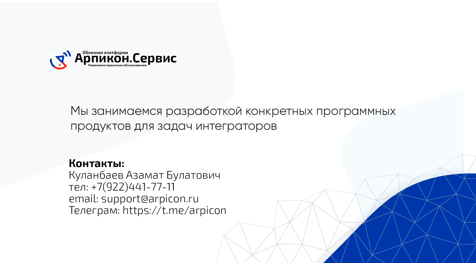 Куланбаев Азамат Булатович Тел: +7 (922)441-77-11 Email: support@arpicon.ru