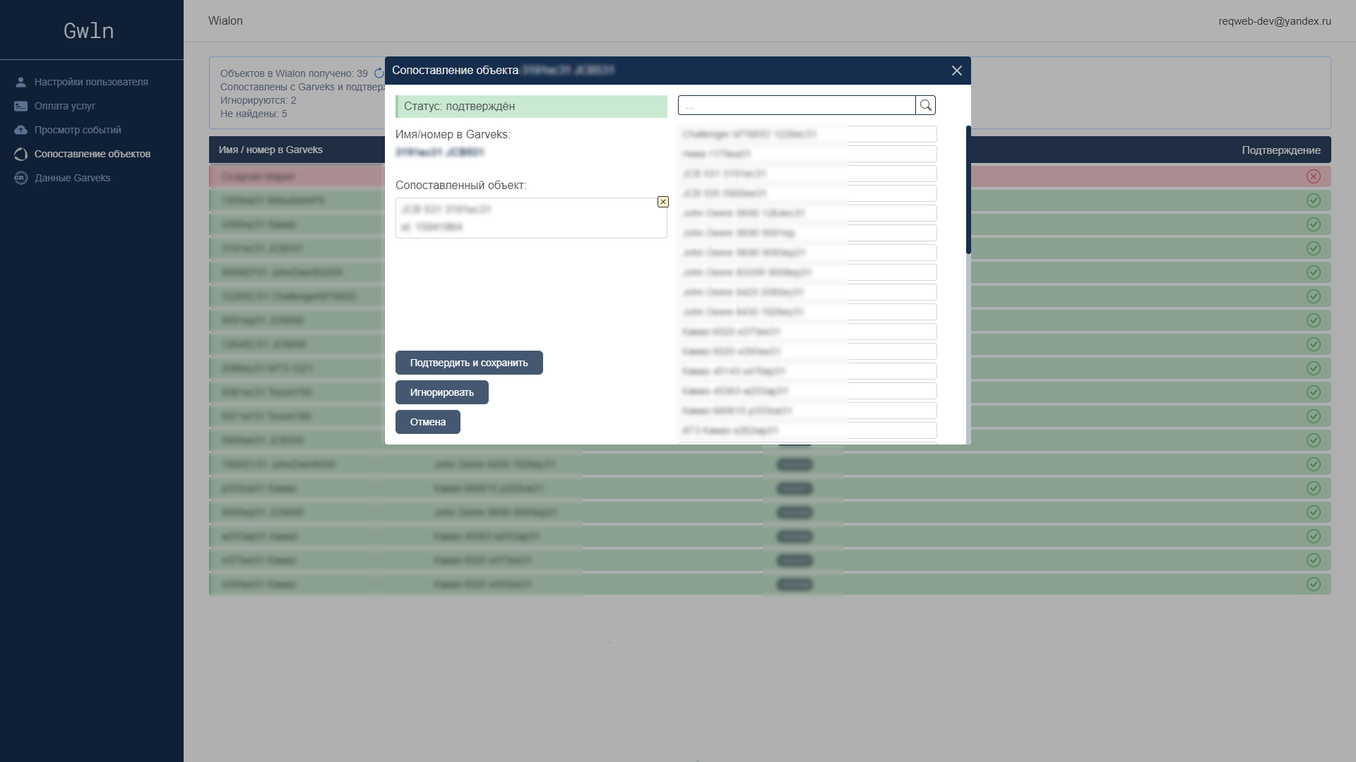 Объекты "привязываются" автоматически, если номер ТС или имя ТС в Garveks будет найдено в Wialon.
