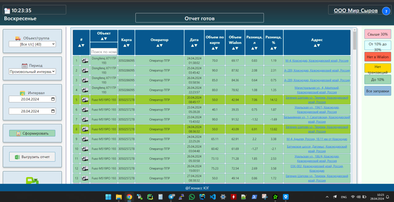 И вопрос другой, есть у кого готовый отчет по аналитике работы техники, куда попадают данные с мониторинга, азс газпром/роснефть и т.д., где видно нормы и выделение разным цветом их пороги, а так же показатели погрешности выше 5 %, так же показывающие цветом.