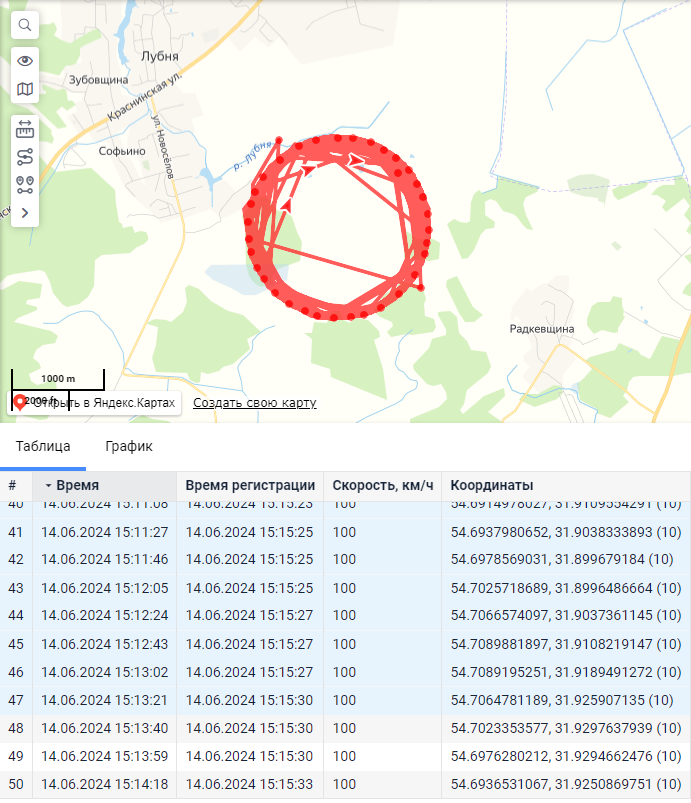 Вопрос:  могли бы вы в Wialon сделать автоматическое определение этих кругов и отсекать их, подставляя последнюю реальную координату ?   РЭБ видна по тому, что это правильной формы круг и скорость почти всегда ровно 100 км/ч.