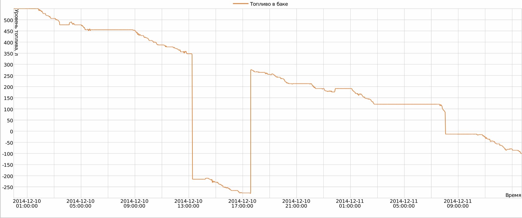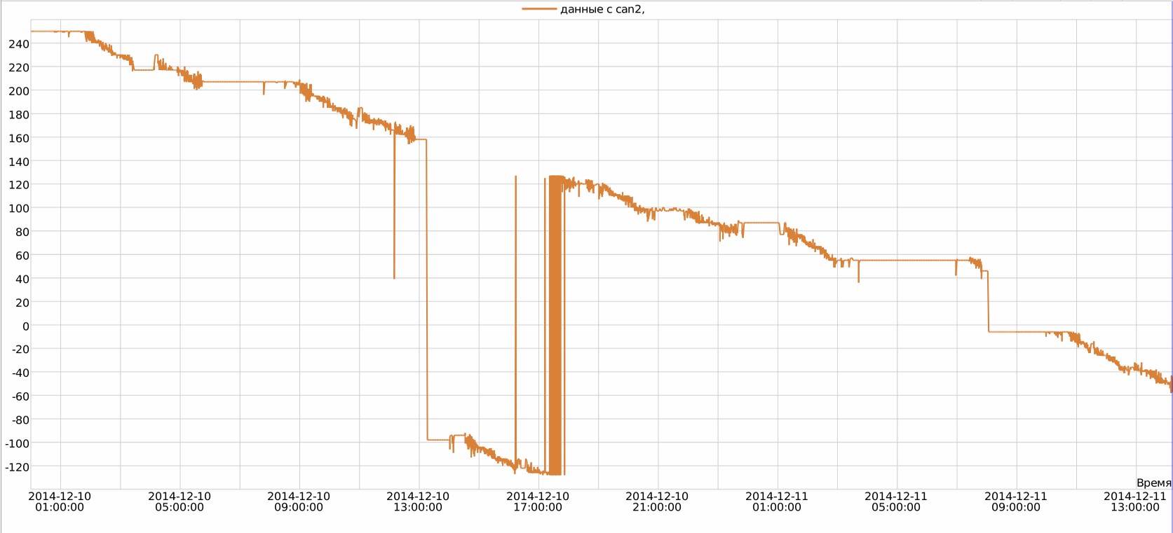 Снимаем данные с CAN на MANе, все работало отлично. Но в последние два дня наблюдаем странную картину. Данные "падают" в отрицательные значения, как при расходе, так и при заправке.